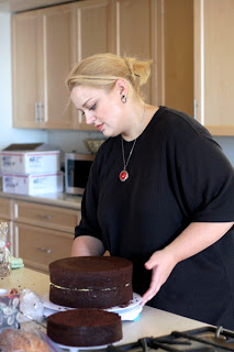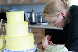 After the crumb-coat, things get more lavish. Another key point. Don’t skimp on the frosting. Erinlea arrived with an enormous bowl full of frosting – more than I have ever seen in one place. It’s important not to be miserly here, especially if it’s a wedding cake. Most of my cake frosting anxiety can be traced to the fact that I always make too little.