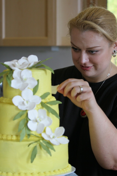 And there is the cake in all its glory. (There were a few steps I missed – like that sweet piping at the bottom, yellow on yellow, amazing! or when she inserted the support rods – I’d do anything to see that in action).