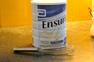 Each element in the arrangement is crucial and keeping the cups and whisk and jug and syringe in one place has been a challenge. So many different people wash the dishes in our house in the course of a day and everyone has their own idea of what goes where. Sometimes we fish the plastic cups for the medicines out of the cutlery drainer; sometimes we find them tucked inside the big Ensure cup in a pool of water. Sometimes the whisk is discovered in with the ones we use for eggs and whipping cream; sometimes standing up in a water glass.