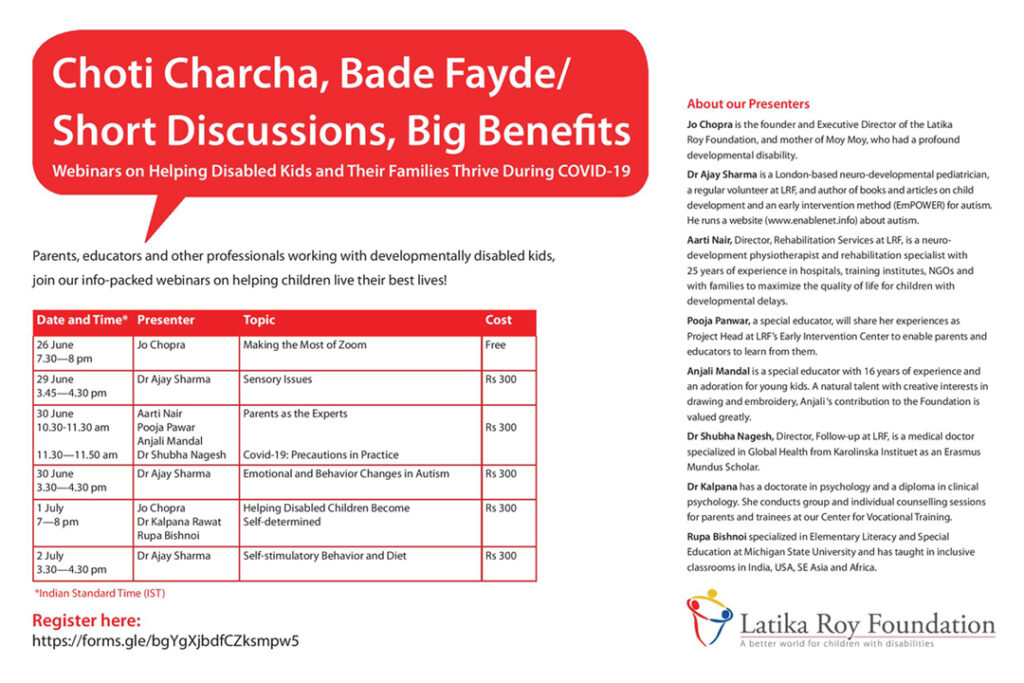 Chhoti Charcha Bade Fayde/ Small Discussions, Big Benefits: Our webinar series on helping developmentally disabled kids thrive! NEW Visit link: https://forms.gle/bgYgXjbdfCZksmpw5